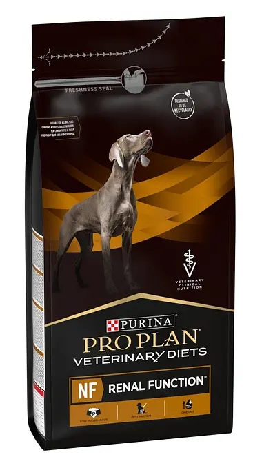 Pro Plan Veterinary Diets NF Renal Function Canine (Про План Ветеринарна дієта НФ Ренал фанкшн) - сухий повнораціонний дієтичний корм для дорослих собак, для підтримання функції нирок при хронічній хворобі нирок. Корм рекомендований для підтримки ниркової функції при хронічній нирковій недостатності, з обмеженим вмістом високоякісного білка і фосфору. Цей дієтичний раціон також застосовується для зниження утворення уратного і цистинового каміння, з низьким рівнем пуринів, помірним рівнем сірковмісних амінокислот і властивістю, що підлуговує сечу.