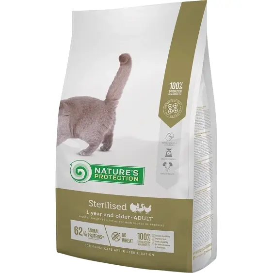 Nature's Protection Sterilised з м’ясом птиці для стерилізованих котів від 1 року та старше - це повнораціонний збалансований сухий корм супер преміум класу з високоякісними джерелами білка та сировини. Склад цього сухого корму збагачений інгредієнтами, які ідеально підходять для забезпечення необхідної кількості калорій, вітамінів і мінералів для котів після стерилізації.
