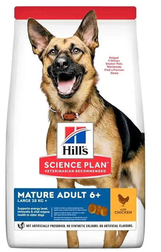Hill's Science Plan Mature Adult 6+ Large Breed with Chicken — це збалансований корм супер-преміум класу для зрілих собак великих і гігантських порід у віці понад 6 років. Корм приготований з ретельно відібраних інгредієнтів і рекомендується як харчування, створене для задоволення особливих вікових потреб собак великих порід. До складу корму введені активні інгредієнти глюкозамін і хондроїтин — речовини, здатні захистити здоров'я суглобів собаки та допомогти збереженню їх гнучкими більш тривалий час. Крім того, корм має оптимальний мінеральний склад, який дозволить підтримати життєво важливі органи — серце і нирки. Також склад містить L-карнітин, який допомагає перетворювати жир в енергію і таким чином, разом з високоякісним протеїном у вигляді курячого м'яса, сприяє підтримці обсягу м'язової маси собаки в нормі. На додаток корм збагачений Омега-3 та Омега-6 жирними кислотами, які позитивно впливають на стан шкіри та хутра, допомагаючи регулювати вміст вологи в них.