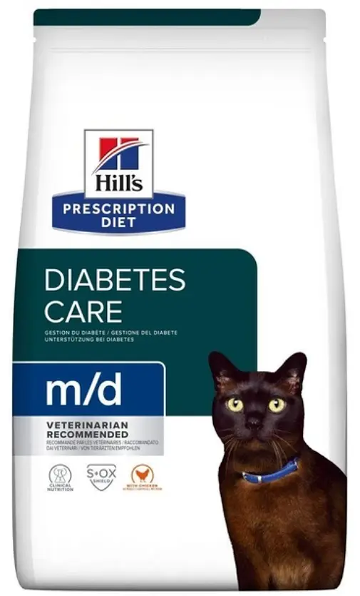 Hill’s Prescription Diet m/d – Сухий корм з куркою для котів, повнораціонна дієта для регулювання надходження глюкози при цукровому діабеті у дорослих котів. Раціон містить низький рівень моно- і дисахаридів. Корм для котів Hill’s Prescription Diet m/d також може застосовуватися у якості альтернативного дієтологічного харчування для зниження зайвої ваги у котів. Високий вміст L-карнітину допомагає спалювати жир і підтримувати м’язову масу.