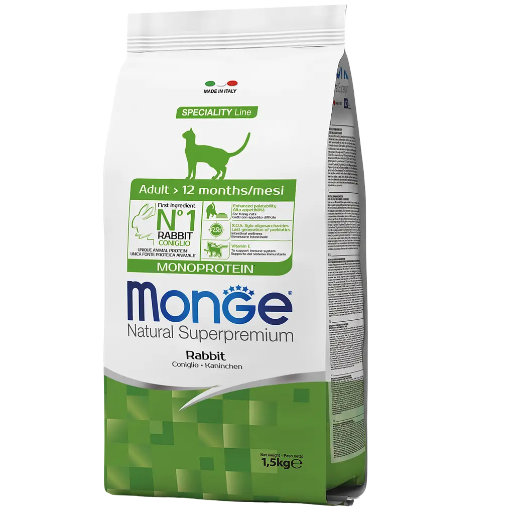 Сухий корм Monge Cat Adult – дуже смачний корм для котiв. Мiй кiт із задоволенням їсть цей сухий корм. Це повноцінний збалансований раціон для дорослих котів, який мiстить м'ясо кролика, що легко засвоюється i дає джерело енергії для кота. Шерсть кота стала дуже гарною! Корм містить найважливіші антиоксиданти для підтримки імунної системи тварин. Також в кормі немає штучних барвників, підсилювачів смаку та консервантів. Рекомендую сухий корм Monge Cat Adult для дорослих котiв.