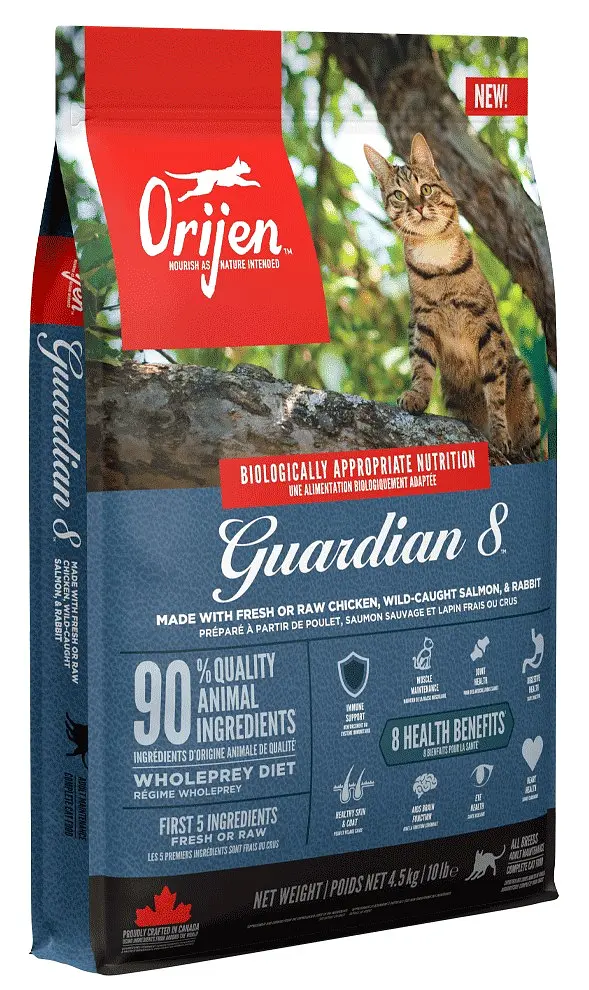 Orijen Guardian 8 – це функціональний суперпреміум-корм, розроблений для підтримки 8 ключових аспектів здоров’я котів. Його унікальна формула містить 90% м’ясних інгредієнтів, з яких 2/3 – свіжі або сирі, включаючи птицю, рибу, яйця та органи – усе, що наближає раціон кота до природного харчування в дикій природі.