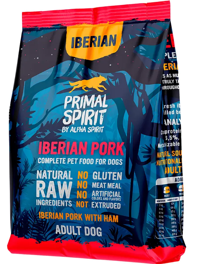 PRIMAL SPIRIT Iberian Pork – повнораціонний сухий корм для дорослих собак з іберійською свининою та шинкою. У складі корму містить 70% свіжих інгредієнтів, включаючи іберійську свинину та шинку, що готуються за найвищих стандартів якості.