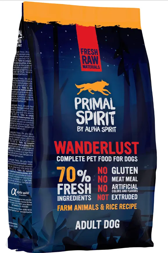 PRIMAL SPIRIT Wanderlust – повнораціонний сухий корм для дорослих собак всіх порід. Безглютеновий корм виготовлений зі свіжих інгредієнтів (70%), з щедрим вмістом м’ясних протеїнів, рисом, з додаванням природних джерел вітамінів та мінералів.