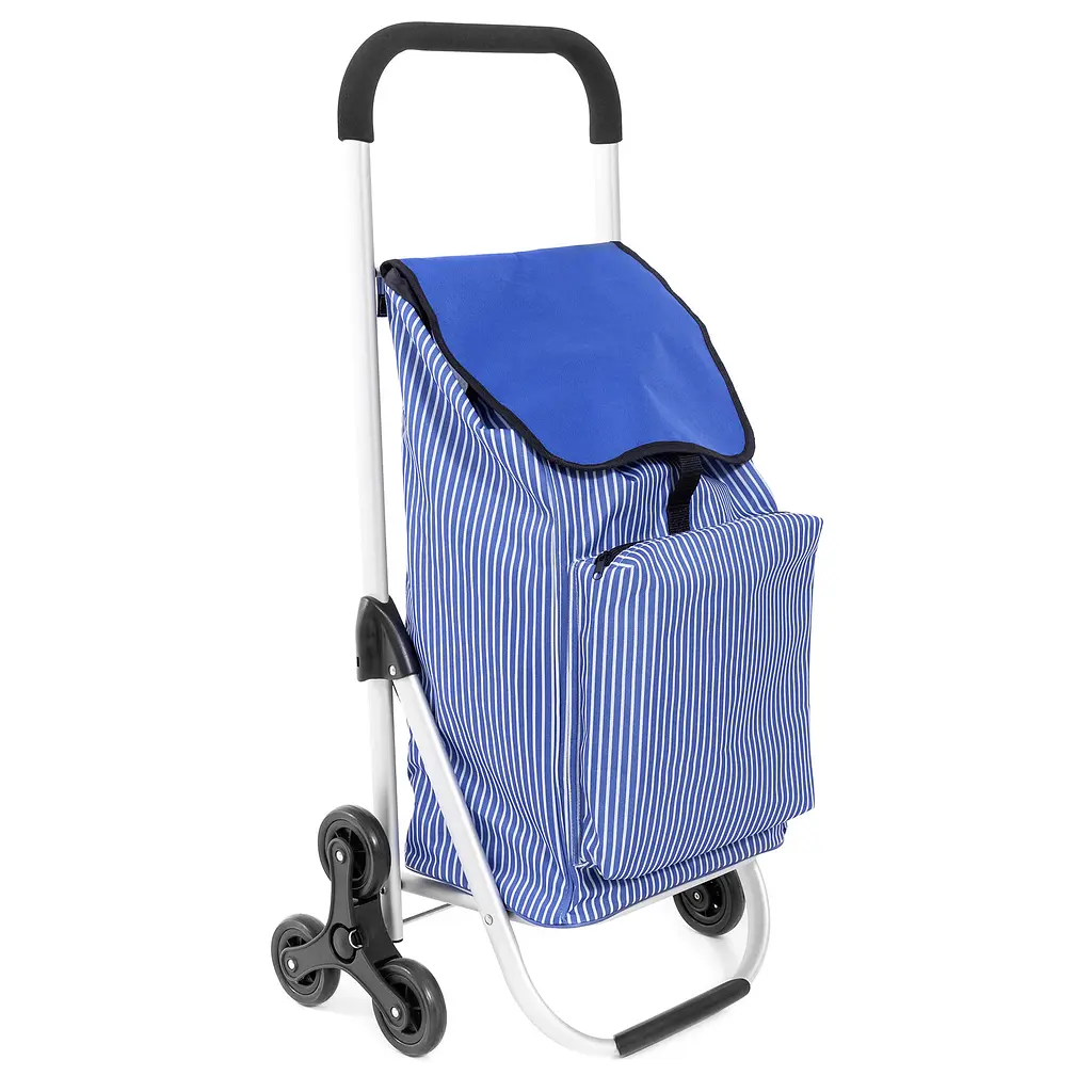 Сумка-візок Casa Si Stairs Blue Stripes — це містка та надзвичайно зручна модель з легким алюмінієвим каркасом та шестиколісною конструкцією, що дозволяє візку легко долати сходи, бордюри та нерівності, забезпечуючи плавний рух без ривків. Три з’єднані колеса з кожного боку обертаються на підшипниках, а шини з піносевілена поєднують еластичність і стійкість до стирання — ідеально для міських умов.