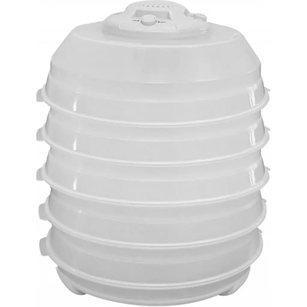 Одночасне сушіння декількох видів продуктів. Модель має циліндричну конструкцію, виготовлену з термостійкого білого пластику. Сушарка оснащена 10 нарощуваними лотками для сушіння продуктів. Це дає можливість одночасного сушіння декількох видів продуктів або їхньої великої кількості, водночас можете легко змінювати кількість лотків.