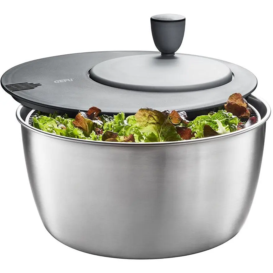 Сушка складається з трьох частин: чаша, сітка-центрифуга і кришка з механізмом. Завдяки вбудованому носику зайва вода легко виливається із стильної чаші з нержавіючої сталі, і все, салат можна готувати і подавати до столу.
