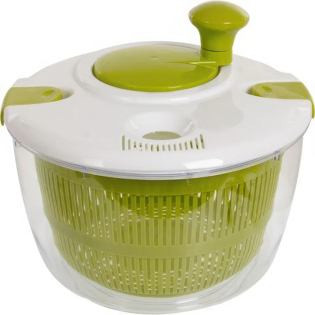 Принцип роботи: обертання ручки приводить внутрішній кошик в рух, внаслідок чого зайва волога швидко стікає у зовнішній контейнер. Це дозволяє зберегти зелень свіжою, хрусткою та готовою до використання, уникнувши ручного витискання чи сушіння серветками. Сушка для зелені також полегшує зберігання свіжих продуктів у холодильнику, забезпечуючи їхню свіжість довше.