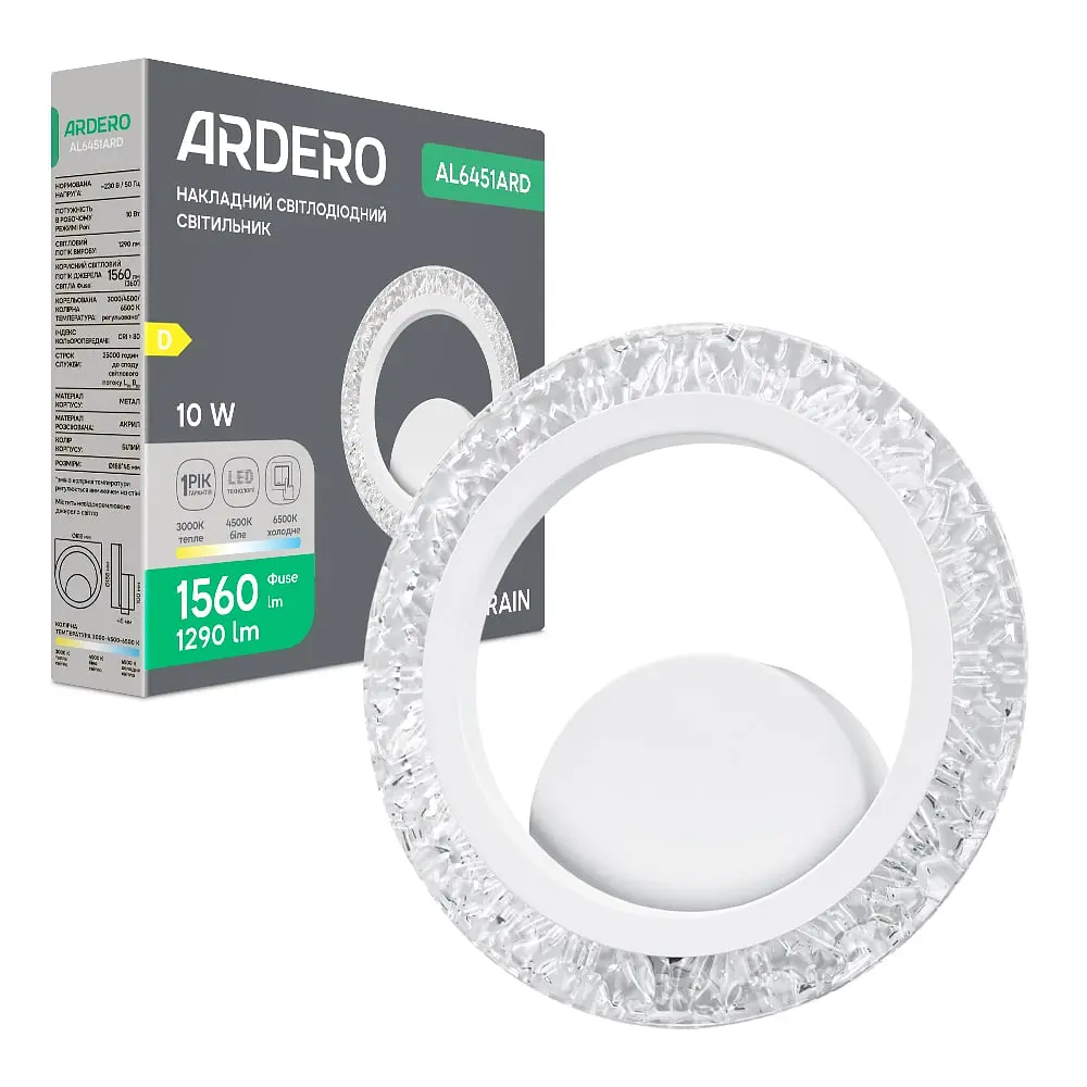 Накладні світлодіодні світильники Ardero AL6451ARD колекція RAIN Накладні світильники-бра для освітлення житлових і комерційних інтер’єрів, готелів, тощо. Переваги та особливості світлодіодного накладного світильника Ardero AL6451ARD 10Вт RAIN білого кольору: Вишукане “кришталеве” оздоблення плафонів Керування кольором свічення за допомогою вимикача на стіні Індекс кольоропередачі CRI≥80 Ступінь захисту IP20 Гарантія 12 місяців Світильники поєднуються за дизайном з люстрами Ardero АL6445ARD AL6455ARD Технічні характеристики можуть змінюватися в залежності від партії Бренд: Ardero Використання: приліжкові (бра) Гарантія: 12 місяців Тип вимикача: ні Кількість в упаковці: 40 Колір: білий Колірна температура: 3000/4500/6500K Матеріал: метал Матеріал плафона: Акрил Напруга мережі: 220-240 Потужність (Вт): 10 Розмір: ø188*45 мм Світловий потік (Lm): 1290 Клас захисту (IP): IP20 Тип джерела світла: LED Тип світильника: бра Форма_виробу: Квадратна Колекція: RAIN