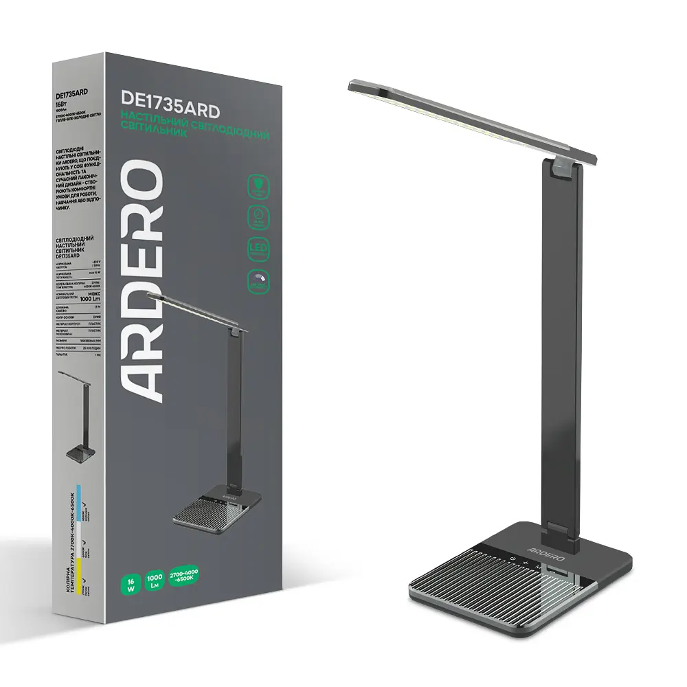 Настільний світлодіодний світильник Ardero DE1735ARD 16W 1000Lm сірий Світлодіодний настільний світильник з підвищеною яскравістю 1000Лм. Модель із сучасним лаконічним дизайном ідеально підійде для інтер'єру офісу або домашнього кабінету чи робочої зони. На основі світильника розташовані тримач для телефону і кнопка керування рівнями яскравості та температури світіння - завдяки цьому світильник можна використовувати для навчання, роботи і відпочинку. Особливості та переваги світильників Ardero DE1735 ARD Економічність. Сучасний світлодіодний світильник, що дозволяє зекономити до 80% електроенергії у порівнянні зі звичайними настільними лампами. Зміна яскравості та колірної температури світіння. Плавне регулювання яскравості дозволяють налаштувати світильник під власні уподобання чи ситуацію або у режимі відпочинку. Надійна конструкція. Світильник виготовлено з якісного міцного пластику що не псується та не змінює колір упродовж користування. Модель представлена в двох кольорах: яскраво-білому та благородному сірому. Комфортне світло. Забезпечує комфортне, якісне, екологічне та безпечне для очей освітлення без пульсації та мерехтіння. Коефіцієнт кольоропередачі Ra>80, що дозволяє сприймати кольори освітлювальних предметів максимально наближеними до природніх. Ресурс роботи: 25000 годин Гарантія: 1 рік. Бренд: Ardero Гарантія: 12 місяців Колір основи: Сірий Колір світіння: Регульований Колірна температура: 2700-6500К Індекс кольору (RA): Ra≥80 Матеріал основи: Пластик Матеріал плафона: Пластик Напруга мережі: 230 Потужність (Вт): 16 Розмір: 180*138*400 мм Світловий потік (Lm): 1000 Клас захисту (IP): IP20 Термін служби: 25000 годин Тип джерела світла: LED Тип світильника: Настільний Можливість димування: так