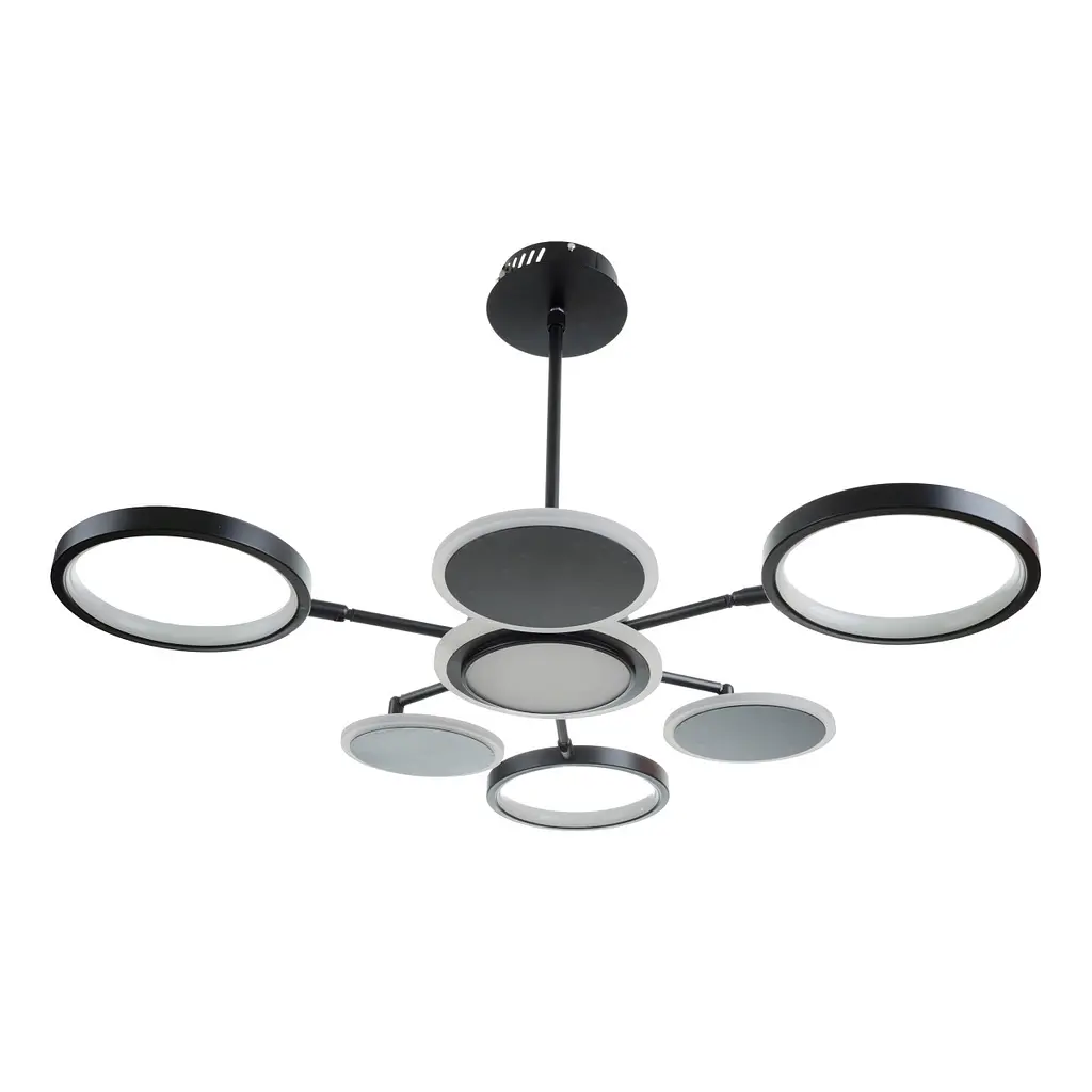Світлодіодна люстра BL-746S/6 WW+CW 78W*2 - це сучасний модний світильник зі стильним дизайном чорного кольору. Модель підійде для спальні, вітальні, передпокою, залу або холу. Має конструкцію, що включає шість кілець-плафонів, три з яких полі, а три - суцільні. Вбудовані світлодіоди загальною потужністю 156 Вт розташовані по окружності кілець, а також на круглому елементі основи світильника. Світлодіодна люстра може забезпечувати теплу або холодну температуру світіння. Світлодіоди генерують світловий потік з віддачею до 75 лм/Вт. ЛЕД джерела дуже економні й мають тривалий термін експлуатації. Люстра створює потужний світловий потік з високим індексом передачі кольору (> 80Ra). Дизайн люстри робить модель відповідною для інтер'єрів, оформлених в різних стилях. Габарити світильника 810* 600 мм.