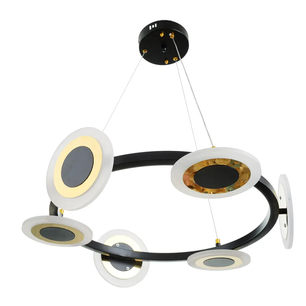 Світлодіодна люстра BL-750S/6 NW 36W - це сучасний модний світильник зі стильним та оригінальним дизайном комбінованого чорно-біло-золотистого кольору. Модель підійде для спальні, вітальні, передпокою, холу або зала. Конструкція складається з шести дискових плафонів, почергово розташованих вертикально та горизонтально, які закріплені на металевому обручі, підвішаному на металевих тросиках до основи. Світильник кріпиться до стелі за допомогою монтажної планки. По окружності плафони оснащені вбудованими світлодіодами загальною потужністю 36 Вт, які випромінюють рівне нейтральне світло. Світлодіоди генерують світловий потік з віддачею до 75 лм/Вт. ЛЕД джерела дуже економні й мають тривалий термін експлуатації. Люстра створює потужний світловий потік з високим індексом передачі кольору (> 80Ra). Дизайн люстри робить модель відповідною для інтер'єрів, оформлених в різних стилях. Габаритні розміри світильника 560*160 мм.
