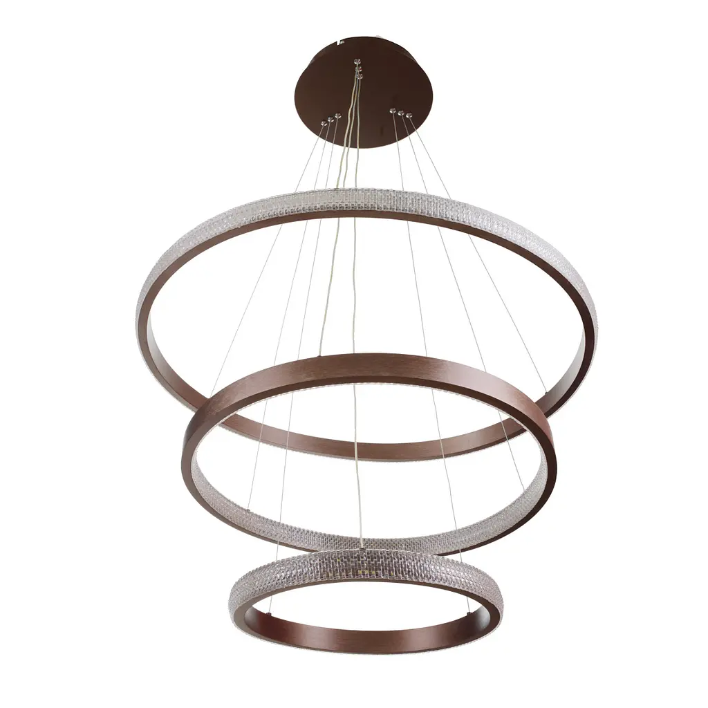 Світлодіодна підвісна люстра BL-765S/3 196W COF - це сучасний модний світильник зі стильним дизайном. Модель призначена для приміщень з високими стелями. Її конструкція включає 3 кола різного діаметру - 40, 60, 80 см, закріплених на металевих тросах, які йдуть від круглої основи. У кожному колі знаходяться вбудовані світлодіоди, що генерують світловий потік з віддачею 60 лм/Вт. Світлодіоди створюють світіння з різними відтінками. Кола на тросиках розміщені послідовно: від більшого до меншого. Люстра відмінно впорається з освітленням великих дворівневих холів і віталень. Також вона підійде для підсвічування кафе, ресторанів, галерей. Модель має велику потужність - 196 Вт, відрізняється лаконічним, але стильним дизайном. ЛЕД джерела дуже економні й мають тривалий термін експлуатації. Люстра створює потужний світловий потік з високим індексом передачі кольору (> 80Ra). Покриття коричневого кольору робить модель відповідною для інтер'єрів, оформлених в різних стилях.