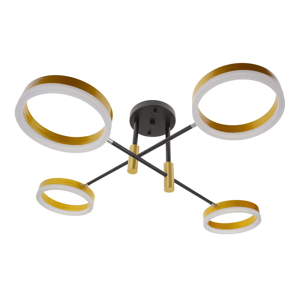 Світлодіодна люстра BR-01 630C/4 LED 48W WW + NW + CW BK/G призначена для освітлення приміщень, інтер'єри яких оформлені в стилі хай-тек, техно, лофт, мінімалізм. Її потужність - 48 Вт. Цього вистачить для освітлення вітальні, спальні, кухні. Також такий світильник можна використовувати для освітлення готелів, невеликих магазинів, кафе і ресторанів. Люстра відрізняється оригінальним дизайном: до чорного металевого корпусу кріпляться тримачі з золотистими кільцями. Модель має 4 вбудованих круглих джерела світла. Вбудовані світлодіоди генерують досить потужний світловий потік з високим індексом передачі кольору - 80Ra. Колір світіння люстри можна міняти. Світлова віддача люстри - 60 лм/Вт. До стелі освітлювальний прилад кріпиться за допомогою монтажної планки.