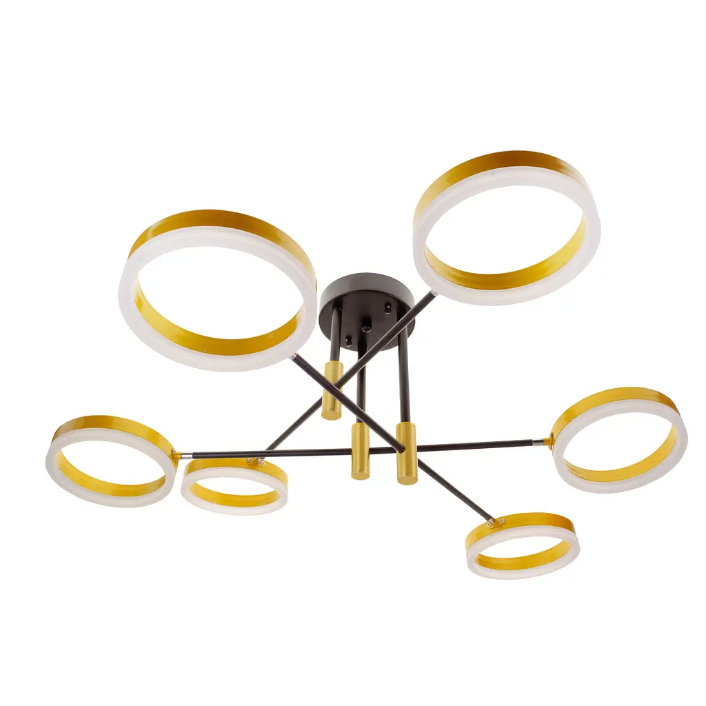 Світлодіодна люстра BR-01 630C/6 LED 72W WW+NW+CW BK/G призначена для освітлення приміщень, інтер'єри яких оформлені в стилі хай-тек, техно, лофт, мінімалізм. Її потужність - 72 Вт. Цього вистачить для освітлення вітальні, спальні, кухні. Також такий світильник можна використовувати для освітлення готелів, невеликих магазинів, кафе і ресторанів. Люстра відрізняється оригінальним дизайном: до чорного металевого корпусу кріпляться тримачі з золотистими кільцями. Модель має 6 вбудованих круглих джерела світла. Вбудовані світлодіоди генерують досить потужний світловий потік з високим індексом передачі кольору - 80Ra. Колір світіння люстри можна міняти (теплий, нейтральний, холодний). Світлова віддача люстри - 60 лм/Вт. До стелі освітлювальний прилад кріпиться за допомогою монтажної планки.