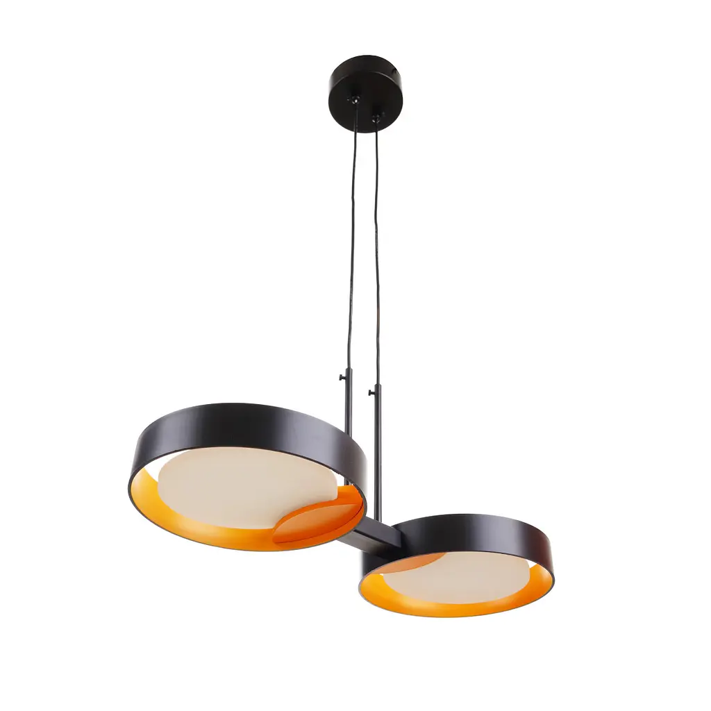 Світлодіодна люстра BR-01 666S/2 LED 10W NW BK/G - це популярний модний світильник зі стильним, оригінальним дизайном чорного та золотого кольору. Модель підійде для спальні, вітальні, передпокою із сучасним інтер'єром. Складається з двох чорних плафонів круглої форми, внутрішня частина яких золотиста та обладнана високоефективними вбудованими світлодіодами загальною потужністю 10 Вт, які забезпечують нейтральний колір світіння. Плафони разом з конструктивним елементом чорного кольору за допомогою підвісу кріпляться до основи світильника. Основа монтується до стелі за допомогою монтажної планки. Світлодіоди генерують світловий потік з віддачею 60 лм/Вт. ЛЕД джерела дуже економні й мають тривалий термін експлуатації. Люстра створює потужний світловий потік з високим індексом передачі кольору (> 80Ra). Люстра призначена для роботи в мережі змінного струму з номінальною напругою 220 В. Рівень захисту корпусу від потрапляння всередину пилу та вологи ІР20.