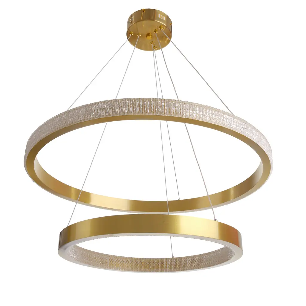 Світлодіодна люстра BR-933S/34W WW G - це популярний модний світильник зі стильним, оригінальним дизайном золотого кольору. Модель підійде для спальні, вітальні, передпокою або кухні із сучасним інтер'єром. Складається з двох кілець-плафонів різного діаметру, підвішаних на різній висоті відносно стелі. Кільця обладнані високоефективними вбудованими світлодіодами загальною потужністю 34 Вт, які випромінюють рівне тепле світло. Кільця тримаються на підвісах, що виходять з основи світильника, яка кріпиться до стелі за допомогою монтажної планки. Світлодіоди генерують світловий потік з віддачею 60 лм/Вт. ЛЕД джерела дуже економні й мають тривалий термін експлуатації. Люстра створює потужний світловий потік з високим індексом передачі кольору (> 80Ra). Люстра призначена для роботи в мережі змінного струму з номінальною напругою 220 В. Рівень захисту корпусу від потрапляння всередину пилу та вологи ІР20.