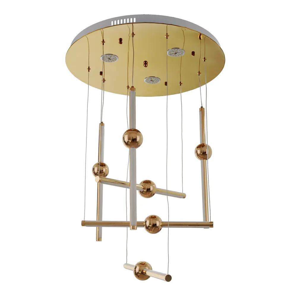 Якщо ви шукаєте сучасні варіанти освітлення, люстра BL-889S/6 NW 85W G підійде найкращим чином. Без декоративних надмірностей, вона оригінальна, але практична. Оснащена світлодіодами, що дозволяє забути про необхідність стежити за наявністю запасних лампочок. LED-джерела працюють до 50 тис. годин, випромінюючи нейтральне біле світло. Люстра складається з шести світлодіодів, які встановлені в металеві стрижні, що кріпляться на шнурах. Три з них розміщені вертикально по відношенню до підлоги, три - горизонтально. Шнури кріпляться до металевої круглої основі, що монтується до стелі. На основі також знаходяться три світлодіоди круглої форми. На стрижнях розміщений декор у вигляді кулі. Вся конструкція виконана в золотистому кольорі. Це відмінний варіант для кафе і ресторанів, офісних і виставкових приміщень, світильник прикрасить житлові квартири і будинки.