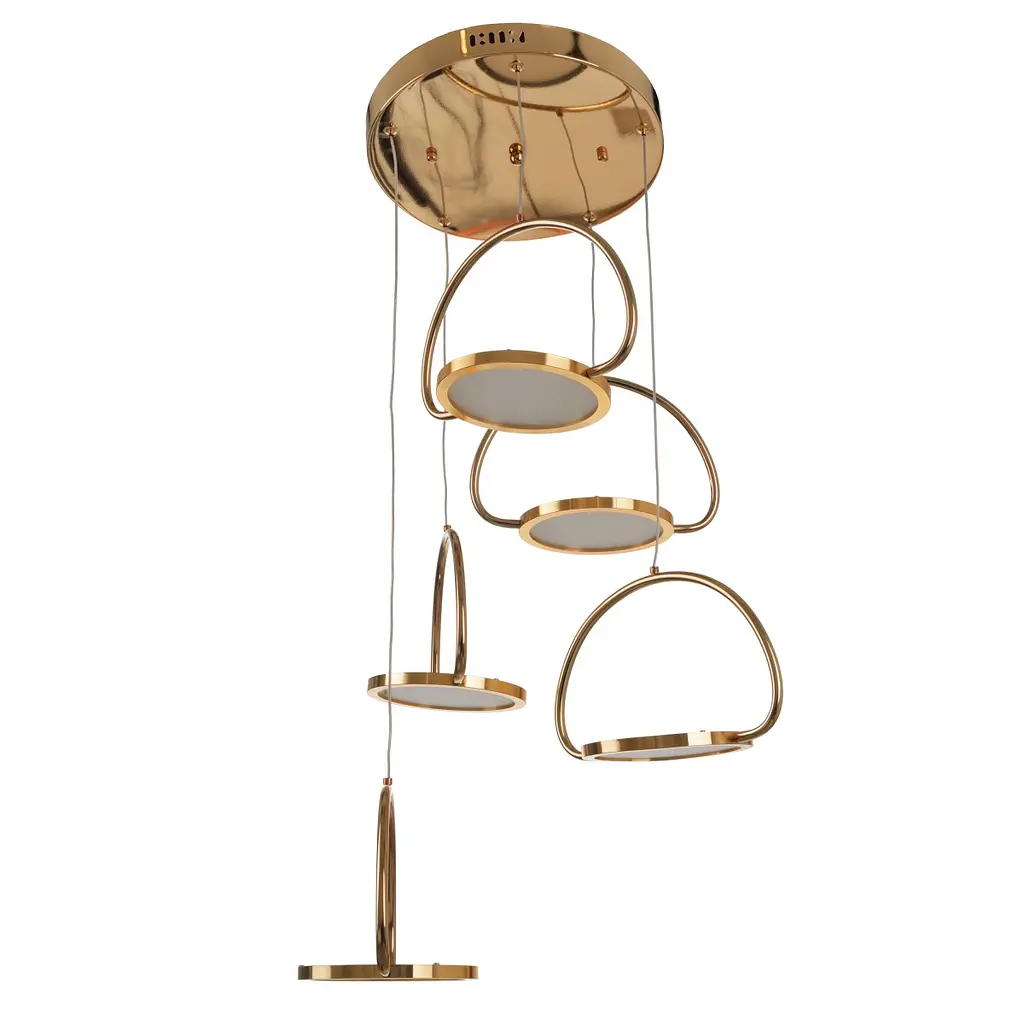 Люстра BL-898S/5 NW 54W G - компактний, витончений варіант освітлення, який дарує яскраве нейтральне біле світло. Її конструкція складається з п'яти стрижнів, що мають форму півкола. Внизу кожного півкола встановлений диск з вбудованими світлодіодами, положення якого можна змінювати. Люстра кріпиться до стелі основою, kriplennia_24 - монтажна планка. Стрижні з основою з'єднані шнурами, які дозволяють регулювати висоту люстри. Стрижні, диски і основа люстри металеві, пофарбовані в золотистий колір. Використання світлодіодів - найбільш сучасний спосіб освітлення. LED значно економічніші, працюють значно довше, ніж інші види джерел освітлення, випромінюють нейтральне біле світло. Ця модель - відмінний варіант світильника для залучення уваги до певної частини приміщення. Підходить для розміщення в будь-яких житлових, офісних, виставкових приміщеннях, а також в кафе і ресторанах як джерело основного освітлення.
