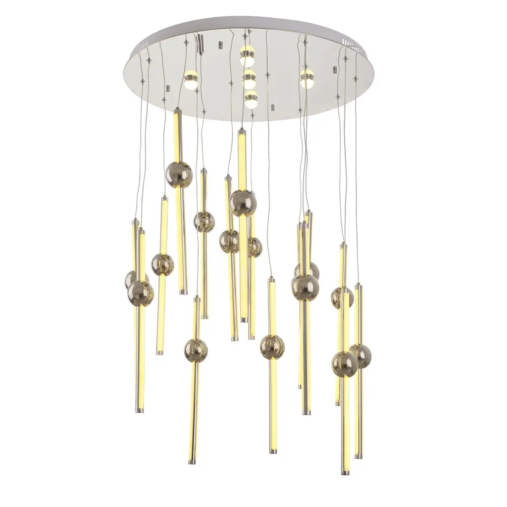Люстра BL-889S/16 NW 230W CH вражає і зачаровує. Її конструкція нагадує форму і будову вітряних дзвіночків, які встановлюють на верандах і балконах. Це ексцентрична, але в той же час практична модель. Оснащена світлодіодами, що дозволить забути про необхідність стежити за наявністю запасних лампочок. LED-джерела працюють до 50 тис. годин, випромінюючи нейтральне біле світло. Люстра складається з шести світлодіодів, які встановлені в металеві стрижні. Стрижні висять на шнурах, довжину яких можна регулювати. Стрижні розміщені вертикально по відношенню до поверхні підлоги. Шнури кріпляться до металевої круглої основі, яка монтується до стелі. На основі також знаходяться п'ять світлодіодів круглої форми. На стрижнях є декор у вигляді кулі. Вся конструкція виконана в золотистому кольорі. Це відмінний варіант для кафе і ресторанів, офісних і виставкових приміщень, також світильник прикрасить житлові квартири і будинки.