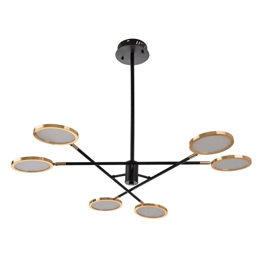 Люстра BL-891S/6 NW 65W G може освітлити будь-яку ділянку приміщення. Вона оснащена світлодіодами, napriam_svitla яких змінюється - поворотні механізми і конструкція люстри дозволяють робити це дуже легко. Модель складається з шести джерел світла, встановлених на дисках. Диски розміщені на кінцях кожного з трьох стрижнів, що кріпляться до циліндра. Світлодіод диска захищає плоский пластиковий білий плафон. До стелі люстра монтується планкою, прихованою в круглій основі. Основа з'єднана з циліндром одним вертикальним стрижнем. Вся конструкція металева. Стрижні і основа пофарбовані в чорний колір, диски - в золотистий. Ця модель - витончений комплімент суворому індустріального стилю, а також іншим сучасним стилям інтер'єру: техно, хай-тек, мілітарі. Вона помітно оновить будь-який звичний інтер'єр. Використання LED дозволить істотно скоротити витрати електроенергії і забезпечить сталий розвиток і всебічне освітлення приміщення. На всю продукцію діє гарантія.