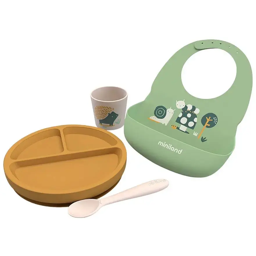 Силіконовий дитячий посуд Set Garden від Miniland - ідеальний вибір для того, щоб познайомити вашого малюка із самостійним годуванням за допомогою методу Baby Led Weaning (BLW). Набір складається з секційної тарілочки з 3 секціями для поділу страв, ергономічної ложки, стаканчика для напоїв, а також нагрудника з великою кишенею для збору крихт.