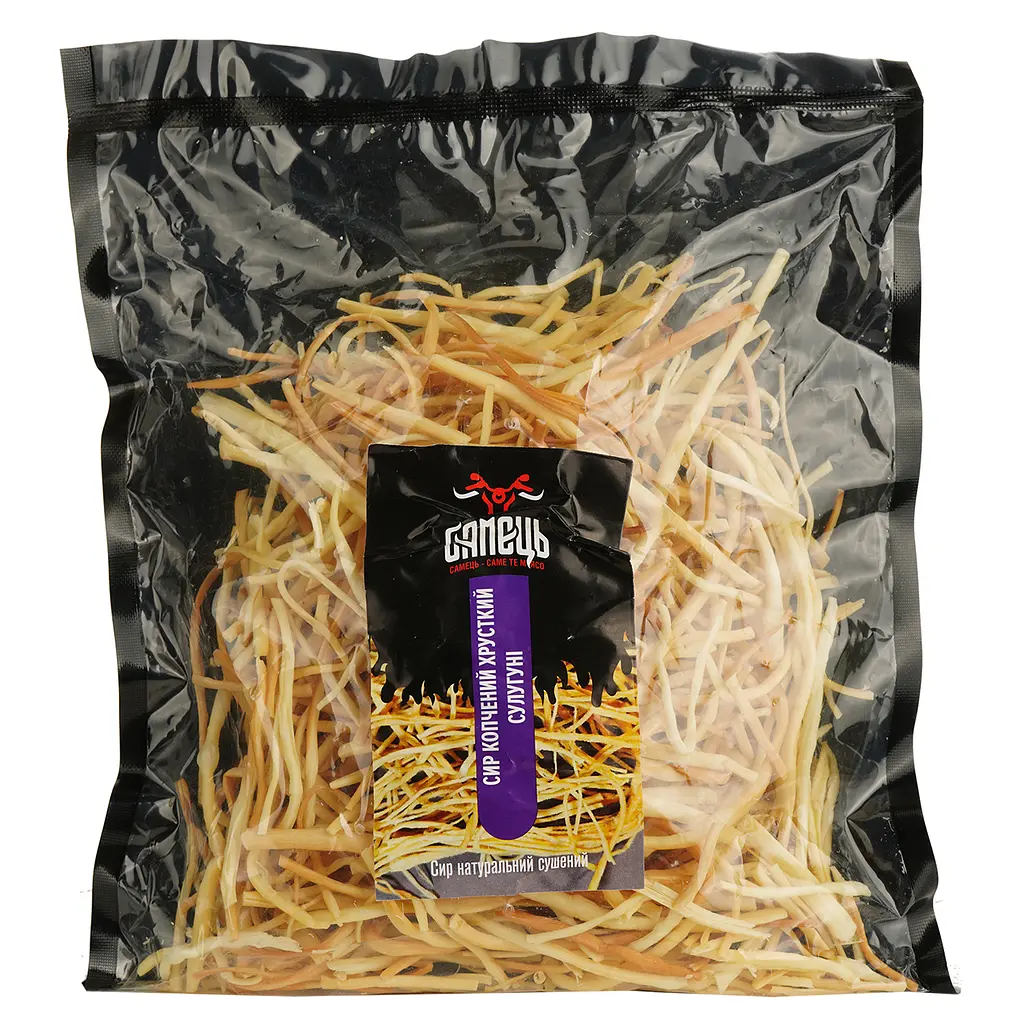 Сир хрусткий Сулугуні - це 100% натуральний сир, без жодної штучної добавки. Вся користь сиру збережена: багатий на білок, не містить вуглеводів. Насичений смак, апетитний вигляд та надзвичайна хрумкість - це все про сушений копчений сир сулугуні.