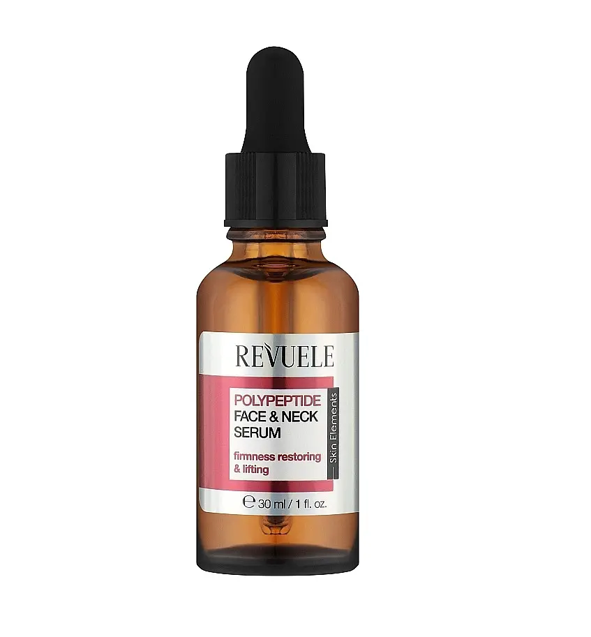 Поліпептидна сироватка для обличчя та шиї Revuele - ефективний антивіковий засіб, який має зволожуючу, поживну, зміцнюючу та підтягуючу дію, стимулює оновлення клітин, зменшує ознаки старіння, розгладжує шкіру, скорочуючи вираженість зморшок та тонких ліній. Ефективний склад активних інгредієнтів надає комплексний вплив на шкіру обличчя, забезпечуючи інтенсивний догляд. Формула засобу поєднує у собі кілька молекул пептидів, які глибоко проникають у шкіру, допомагаючи утворювати волокна колагену та еластину.