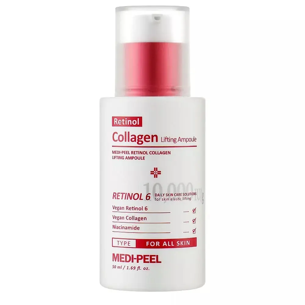 Ліфтинг-ампула MEDI-PEEL Retinol Collagen Lifting Ampoule – це інтенсивний концентрат активів з доведеною ефективністю, які підтягують та розгладжують шкіру, зменшують глибину зморшок, звужують розширені пори та вирівнюють мікрорельєф. Засіб підтримує овал обличчя, зволожує, запускає вироблення колагену та продовжує молодість.