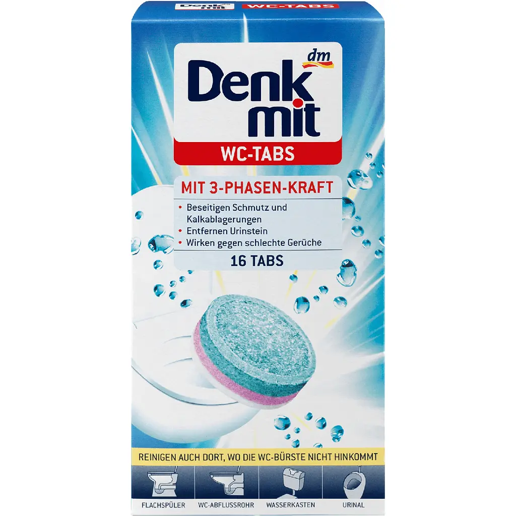 Таблетки для унітазу Denkmit WC Reiniger Tabs для чищення навіть у важкодоступних місцях бачка, унітазу, біде, пісуара. Чистять, дезінфікують, надають свіжості. Відмінно усувають бруд і осад від сечового каменю. Піклуються про гігієнічну чистоту вашого унітазу навіть у важкодоступних місцях. Забезпечують свіжий аромат у ванній кімнаті та туалеті.