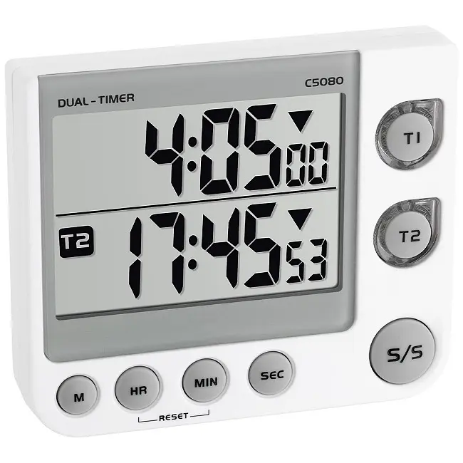 Виробник: TFA Dostmann GmbH & Co.KG, GermanyОсобливості:Таймер з відліком в прямому і в зворотному напрямкуЗі звуковим сигналом (макс. 60 секунд)Довший час (99 годин, 59 хвилин, 59 секунд)Подвійний дисплей для двох одночасних вимірюваньВеликий дисплей3 рівня гучності сигналуСвітлодіодний сигнальний індикатор (змінює колір із зеленого на червоний після закінчення часу)Функція пам'ятіЗ монтажним магнітом, підставкою і підвісною петлею