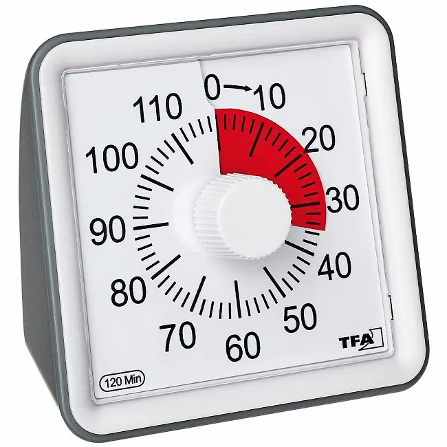 Виробник: TFA Dostmann GmbH & Co.KG, GermanyОсобливості:Аналоговий циферблат з кольоровою індикацією залишкового часу Видимий хід часуЛегке налаштування часу з поворотним циферблатомПрацює безшумно від батарейокТривалість сигналу 3/60 секундГучність звуку сигналу гучно / тихоЗареєстрований дизайн TFAЯк випливає з назви, таймер Visual робить видимим хід часу. Як тільки бажана тривалість в хвилинах буде встановлена за допомогою поворотної ручки - від однієї хвилини до максимум 120 хвилин - час, що залишився, відображається у вигляді червоної смуги дисплея. Ви можете яскраво і ясно побачити, скільки часу залишилося на дисплеї зворотного відліку. Після закінчення часу пролунає звуковий сигнал від 3 до 60 секунд за бажанням. Гучність також можна регулювати на двох рівнях. Завдяки роботі від батареї таймер працює дуже тихо, без механічного цокання. Компактна форма забезпечує надійну опору. Він також відмінно підходить для використання в школі, при виконанні домашніх завдань або для обмеження часу, проведеного за комп'ютером, ігровою консоллю, смартфоном або телевізором. Кольоровий дисплей дозволяє навіть маленьким дітям відразу побачити, коли час минув, і вони також можуть легко налаштувати його.