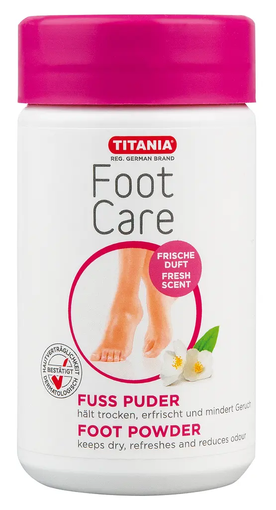 Тальк з дезодоруючим ефектом для ступень ніг Titania для професійного і домашнього використання, підсушує шкіру, вбирає піт, поглинає неприємні запахи.