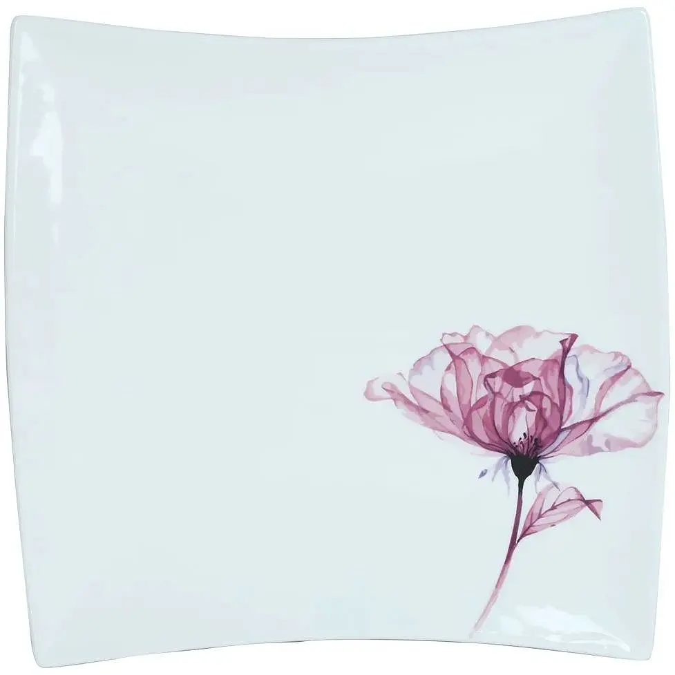 Виготовлена із високоякісної кераміки - це найпопулярніший легкий і міцний матеріал, на якому не залишається слідів від використання столовими предметами. Має квадратну форму з піднятим краєм, що додає їй елегантності та стильності. Білий колір тарілки робить її універсальною та легко поєднується з будь-яким іншим посудом.