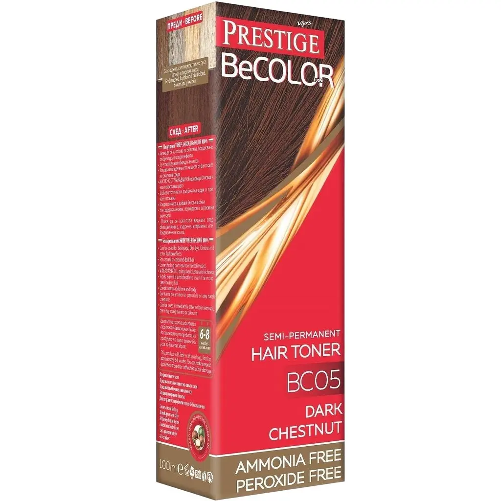 Нова формула засобу від бренду Vip's Prestige допоможе набути ідеального кольору та прибрати надокучливу жовтизну. 100% натуральних масел у складі гарантують безпеку процедури та надають зволожувальний ефект, нагороджуючи локони ідеальним блиском. Продукт не містить окислювачів, перекису та аміаку, дозволяючи провести фарбування у будь-який час, без ризику для здоров'я волосся.
