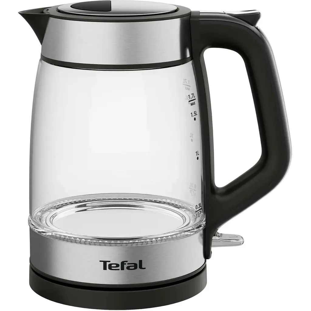 Електрочайник Tefal Glass Kettle KI605830 об'ємом 1,7 літра виготовлений із прозорого скла, що дозволяє контролювати рівень води. Оснащений прихованим нагрівальним елементом потужністю 2200 Вт для швидкого кип'ятіння. Має зручний носик для наливання без розбризкування та внутрішнє підсвічування під час роботи.