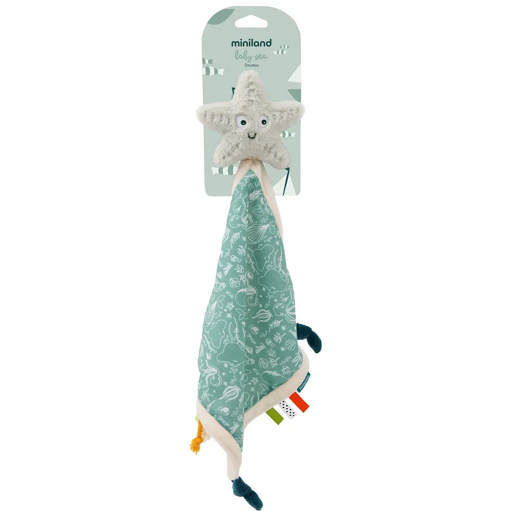 Текстильний комфортер Miniland Baby Sea - м'який комфортер у морському стилі, який малюк може обіймати, тримати у ручках та засипати разом із ним. Легкий, приємний на дотик та безпечний для дітей від народження. Підходить для сну вдома, прогулянок та поїздок: його легко брати із собою, він швидко стає улюбленою "іграшкою-помічником" для спокійного сну. На кінцях комфортера розташовані три невеликі "вузлики-хвостики", до них зручно кріпити пустушку.