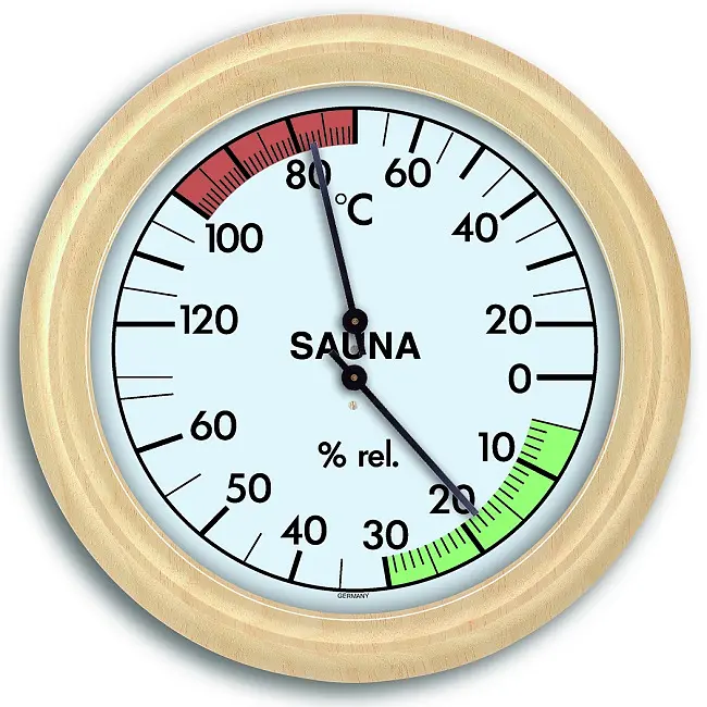 Виробник: TFA Dostmann GmbH & Co.KG, GermanyОсобливості:Вироблено в НімеччиніВимірює температуру і вологість в сауніЗ високоточним механізмом з синтетичним волосомКаркас з дерев'яного масивуТермостійкі матеріалиЗа допомогою цього комбінованого пристрою ви можете контролювати температуру і вологість у вашій сауні і, таким чином, забезпечувати максимально можливий комфорт. Велика шкала читається дуже добре, а оптимальна область відзначена кольором. Це дозволяє швидко побачити, чи підтримується в сауні правильний клімат. Термогігрометр має міцний каркас з дерев'яного масиву і повністю виготовлений в Німеччині. Температура вимірюється за допомогою перевіреної біметалевої технології. Гігрометр працює з використанням високоточного механізму з синтетичним волосом.Зроблено у НімеччиніОсновним елементом TFA є власне виробництво механічних погодних інструментів. Ми створюємо продукцію, що відповідає етикетці «Зроблено в Німеччині», з використанням найсучасніших технологій виробництва і традиційного ремісничого виробництва.Продукція від TFA переконує у функціональності та дизайні.