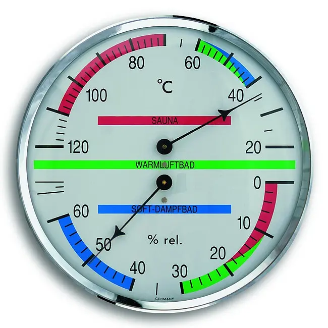 Виробник: TFA Dostmann GmbH & Co.KG, GermanyОсобливості:Вироблено в НімеччиніВимірює температуру і вологість в сауніГігрометр з високоточним механізмом з синтетичним волосомПластиковий корпус з хромованим латунним обідкомКольорове маркування зон комфорту для різних типів саунСпецифікація:Комплектація: Термогігрометри, інструкція з експлуатаціїДіапазон вимірювання температури: +20...+120 °CДіапазон вимірювання вологості: 0...67%Матеріал: Пластик, металКолір: Сріблястий / БілийВстановлення: НастіннийРозміри: 136 x 37 x 136 ммВага: 162 гСауна тримає вас у формі і здоровим, але тільки якщо все зроблено правильно. За допомогою цього комбінованого пристрою ви можете контролювати температуру і вологість у вашій сауні і, таким чином, забезпечувати максимально можливий комфорт. Шкала має кольорове маркування зон комфорту для різних типів саун. Це дозволяє швидко побачити, чи підтримується правильний клімат в сауні. Термогігрометр має обідок з хромованої латуні і повністю виготовлений в Німеччині. Температура вимірюється за допомогою перевіреної біметалевої технології. Гігрометр працює з використанням високоточного механізму з синтетичним волосом.Вироблено в НімеччиніОсновним елементом TFA є власне виробництво механічних погодних інструментів. Ми створюємо продукцію, що відповідає етикетці «Зроблено в Німеччині», з використанням найсучасніших технологій виробництва і традиційного ремісничого виробництва.Продукція від TFA переконує у функціональності та дизайні.Quality-Product byTFA Dostmann GmbH & Co.KGGermany