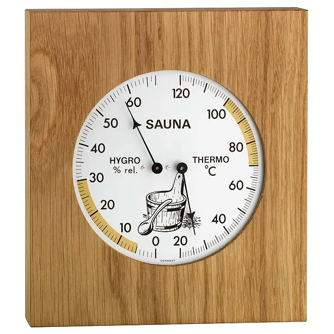 Виробник: TFA Dostmann GmbH & Co.KG, GermanyОсобливості:Вироблено в НімеччиніВимірює температуру і вологість в сауніГігрометр з високоточним механізмом з синтетичним волосомКаркас з промасленого дуба, особливо вишукана структураТермостійкі матеріалиСпецифікація:Комплектація: Термогігрометр, інструкція з експлуатаціїДіапазон вимірювання температури: +20...+120 °CДіапазон вимірювання вологості: 0...67%Матеріал: Дуб, змащений масломКолір: НатуральнийВстановлення: НастіннийРозміри: 180 x 45 x 200 ммВага: 462 гСауна тримає вас у формі і здоровим, але тільки якщо все зроблено правильно. За допомогою цього комбінованого пристрою ви можете контролювати температуру і вологість у вашій сауні і, таким чином, забезпечувати максимально можливий комфорт. Оптимальна зона позначена кольором. Це дозволяє швидко побачити, чи підтримується в сауні правильний клімат. Завдяки змащеній поверхні структура дуба набуває контраст і глибину і виглядає особливо вишуканою. Термогігрометр повністю виготовлений в Німеччині. Температура вимірюється за допомогою перевіреної біметалевої технології. Гігрометр працює з використанням високоточного механізму з синтетичним волосом.Вироблено в НімеччиніОсновним елементом TFA є власне виробництво механічних погодних інструментів. Ми створюємо продукцію, що відповідає етикетці «Зроблено в Німеччині», з використанням найсучасніших технологій виробництва і традиційного ремісничого виробництва.Продукція від TFA переконує у функціональності та дизайні.Quality-Product byTFA Dostmann GmbH & Co.KGGermany
