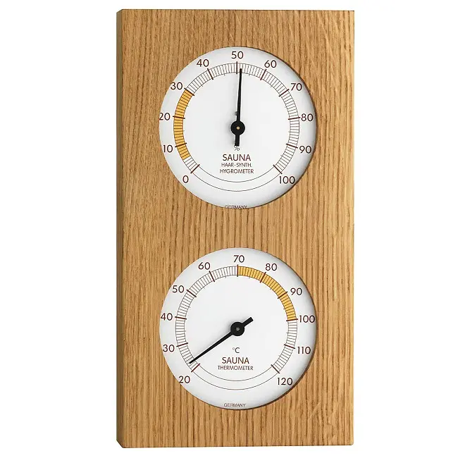 Виробник: TFA Dostmann GmbH & Co.KG, GermanyОсобливості:Вироблено в НімеччиніВимірює температуру і вологість в сауніГігрометр з високоточним механізмом з синтетичним волосомКаркас з промасленого дуба, особливо вишукана структураТермостійкі матеріалиСпецифікація:Комплектація: Термогігрометр, інструкція з експлуатаціїДіапазон вимірювання температури: +20...+120 °C, розрішення 1 °CДіапазон вимірювання вологості: 0...100%, розрішення 1%Матеріал: Дуб, змащений масломКолір: НатуральнийВстановлення: НастіннийРозміри: 130 x 40 x 242 ммВага: 371 гСауна тримає вас у формі і здоровим, але тільки якщо все зроблено правильно. За допомогою цього комбінованого пристрою ви можете контролювати температуру і вологість у вашій сауні і, таким чином, забезпечувати максимально можливий комфорт. Оптимальна зона позначена кольором. Це дозволяє швидко побачити, чи підтримується в сауні правильний клімат. Завдяки змащеній поверхні структура дуба набуває контраст і глибину і виглядає особливо вишуканою. Термогігрометр повністю виготовлений в Німеччині. Температура вимірюється за допомогою перевіреної біметалевої технології. Гігрометр працює з використанням високоточного механізму з синтетичним волосом.Вироблено в НімеччиніОсновним елементом TFA є власне виробництво механічних погодних інструментів. Ми створюємо продукцію, що відповідає етикетці «Зроблено в Німеччині», з використанням найсучасніших технологій виробництва і традиційного ремісничого виробництва.Продукція від TFA переконує у функціональності та дизайні.Quality-Product byTFA Dostmann GmbH & Co.KGGermany