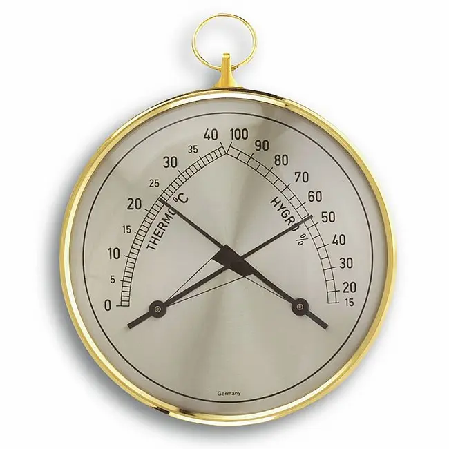 Виробник: TFA Dostmann GmbH & Co.KG, GermanyОсобливості:Вироблено в НімеччиніДля контролю температури та вологостіДля здорового клімату у приміщенніБіметалева технологіяКорпус з латунним кільцемНе потребує батарейокГарантія 3 рокиЧи почуваємось ми добре і комфортно вдома, багато в чому залежить від якості повітря в приміщенні. Дуже важливо контролювати вологість і температуру повітря у приміщенні, оскільки надто вологе повітря у приміщенні сприяє появі небезпечної цвілі; Проте надто сухе повітря у приміщенні може негативно вплинути на наше самопочуття в кількох аспектах: шкіра та дихальна система можуть постраждати та зазнати впливу інфекцій, можуть з'явитися алергія та симптоми астми. Домашні тварини, рослини, дерев'яні підлоги, антикварні меблі, музичні інструменти та книги також потребують належних кліматичних умов. Термогігрометр "CLIMATHERM" у вигляді класичного кишенькового годинника з латунною рамкою є ідеальним приладом для моніторингу клімату в приміщенні. На шкалі виділено область оптимального співвідношення температури та вологості. Ви можете легко стежити за температурою та вологістю та регулювати їх за допомогою спрямованого обігріву та вентиляції. Так ви створите приємне і здорове місце існування і навіть заощадите на витратах на опалення. Механізм гігрометра складається з біметалічної котушки з покриттям, що обертається навколо металевого дроту. Температура вимірюється за допомогою перевіреної біметалічної технології.Термогігрометр повністю виготовлений у НімеччиніОсновним елементом TFA є власне виробництво механічних погодних інструментів. TFA створює продукцію, що відповідає етикетці «Зроблено в Німеччині», з використанням найсучасніших технологій виробництва і традиційного ремісничого виробництва.Продукція від TFA переконує в функціональності і дизайні.