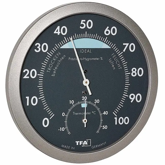 Виробник: TFA Dostmann GmbH & Co.KG, GermanyОсобливості:Вироблено в НімеччиніДля контролю температури та вологості у приміщенніДля здорового клімату у приміщенніТочний гігрометр із синтетичним волосомБіметалічна технологія вимірювання температуриІндикація зон комфортуСкляна кришкаІнтегрована підставкаНе потребує батарейокЗареєстрований дизайн TFAГарантія 3 рокиЧи почуваємось ми добре і комфортно вдома, багато в чому залежить від якості повітря в приміщенні. Дуже важливо контролювати вологість і температуру повітря у приміщенні, оскільки надто вологе повітря у приміщенні сприяє появі небезпечної цвілі; Проте надто сухе повітря у приміщенні може негативно вплинути на наше самопочуття в кількох аспектах: шкіра та дихальна система можуть постраждати та зазнати впливу інфекцій, можуть з'явитися алергія та симптоми астми. Домашні тварини, рослини, дерев'яні підлоги, антикварні меблі, музичні інструменти та книги також потребують належних кліматичних умов. Цей термогігрометр із високоточним механізмом гігрометра із синтетичним волоссям - ідеальний інструмент для моніторингу клімату в приміщенні. Ви можете легко стежити за температурою та вологістю та регулювати їх за допомогою цільового опалення та вентиляції, коли значення виходять за межі зазначених рівнів комфорту. Так ви створите приємне і здорове місце існування і навіть заощадите на витратах на опалення. Просто повісьте термогігрометр на стіну або встановіть на плоску поверхню за допомогою вбудованої підставки. Гігрометр працює з використанням високоточного механізму із синтетичним волосом.Температура вимірюється за допомогою перевіреної біметалічної технології.Термогігрометр повністю виготовлений у НімеччиніОсновним елементом TFA є власне виробництво механічних погодних інструментів. TFA створює продукцію, що відповідає етикетці «Зроблено в Німеччині», з використанням найсучасніших технологій виробництва і традиційного ремісничого виробництва.Продукція від TFA переконує в функціональності і дизайні.