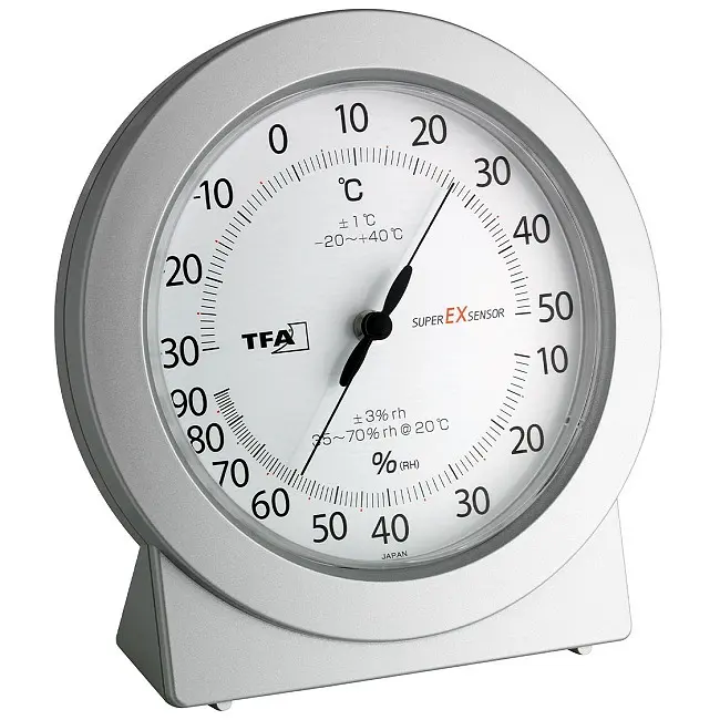 Виробник: TFA Dostmann GmbH & Co.KG, GermanyОсобливості:Зроблено в Японії для TFA Dostmann GmbH & Co.KGДля контролю температури та вологості у приміщенніДля здорового клімату у приміщенніШвидкий та точний сенсор "superEXsensor"Ідеально підходить для професійного використання, для клімат-контролю в житлових кімнатах, коморах та випробувальних приміщенняхНе вимагає батарейокТочність: температура ±1 °C (-20...+40 °C), вологість ±3% (35...70% при +20 °C)Чи почуваємось ми добре і комфортно вдома, багато в чому залежить від якості повітря в приміщенні. Дуже важливо контролювати вологість і температуру повітря у приміщенні, оскільки надто вологе повітря у приміщенні сприяє появі небезпечної цвілі; проте надто сухе повітря у приміщенні може негативно вплинути на наше самопочуття в кількох аспектах: шкіра та дихальна система можуть постраждати та зазнати впливу інфекцій, можуть з'явитися алергія та симптоми астми. Домашні тварини, рослини, дерев'яні підлоги, антикварні меблі, музичні інструменти та книги також потребують належних кліматичних умов. Якщо потрібні швидкі та точні вимірювання клімату, цей точний термогігрометр TFA є ідеальним. Завдяки вбудованому японському сенсору superEXsensor він забезпечує особливо точні значення температури і вологості і тому ідеально підходить для використання в приватному і комерційному секторі. Це забезпечує надійний клімат-контроль у житлових приміщеннях, а також у складських приміщеннях, випробувальних приміщеннях чи лабораторіях.
