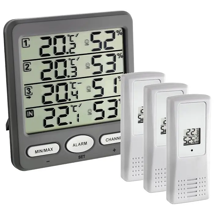 Виробник: TFA Dostmann GmbH & Co.KG, GermanyОсобливості:Моніторинг температури і вологості повітря в 4-х приміщенняхВ комплекті 3 зовнішніх бездротових датчика температури і вологостіМожливість розширення до 8 зовнішніх бездротових датчиків температури і вологостіМаксимальні і мінімальні значенняВізуальний і звуковий сигналізатор для встановлених порогових значеньІндикатори спрямованості зміни температуриРівень комфорту в кожному приміщенніМожливість калібрування вимірювань температури і вологості на базовій станції за допомогою зовнішнього, більш точного опорного джерелаЗовнішня температура і вологість передаються від бездротового зовнішнього датчика на частоті 433 МГц, відстань передачі до 100 метрів (відкритий простір)Зовнішній бездротової датчик з РК-дисплеємВеликий дисплей, який добре читаєтьсяПринаймні дві третини життя людина проводить в приміщенні. Чи відчуваємо ми там себе добре і комфортно, багато в чому залежить від якості повітря в приміщенні. Цифровий бездротовий термогігрометр KLIMA-MONITOR дозволяє одночасно контролювати мікроклімат в чотирьох приміщеннях. З трьома комплектними бездротовими передавачами температуру і вологість можна вимірювати в інших приміщеннях (спальня, дитяча кімната, підвал, зимовий сад і т.п.) або на відкритому повітрі. Вбудовані датчики базової станції вимірюють значення на місці її установки. Значення сигналів тривоги можуть бути встановлені для всіх точок вимірювання. Індикатор комфорту дозволяє дізнатися, чи знаходяться поточні значення в діапазоні дуже сухого, занадто вологого або ідеального рівня. Завдяки цілеспрямованому опаленню та вентиляції ви створюєте приємне і здорове середовище проживання і навіть економите на витратах на опалення. KLIMA-MONITOR можна розширити до 8 бездротових передавачів.