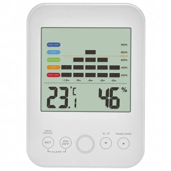 Виробник: TFA Dostmann GmbH & Co.KG, GermanyОсобливості:Для контролю мікроклімату у приміщенніТемпература та вологість у приміщенніІндикація максимальних та мінімальних значень із ручним скиданнямІндикація гістограми вологості протягом останніх 12 годинЗ кольоровими зонами комфорту для здорового клімату у приміщенніТочка росиСигналізація небезпеки пліснявиРегульована сигналізація вологості з верхньою та нижньою межеюНастінний монтаж або установка на стілЛюди проводять як мінімум дві третини свого життя у приміщенні. Чи відчуваємо себе там комфортно, багато в чому залежить від якості повітря у кімнаті.Цифровий термогігрометр - ідеальний вимірювальний прилад контролю мікроклімату в приміщенні. Ви можете легко стежити за температурою та вологістю в приміщенні та регулювати їх за допомогою цільового обігріву та вентиляції. Таким чином ви створите комфортне і здорове місце існування і навіть заощадите на опаленні.Чому мікроклімат у приміщенні важливий для здоров'я?Цвіль і кліщі дійсно поширюються лише за умови високої вологості повітря. Але надто сухе повітря у приміщенні також може по-різному впливати на наше самопочуття. Шкіра та органи дихання зазнають стресу, а інфекції, алергії та астма легко переносяться. Дослідження показали, що відносна вологість повітря у приміщенні від 40 до 60% зводить до мінімуму кількість патогенів та, отже, респіраторних захворювань.Слідкуйте за мікрокліматом і будьте здорові!