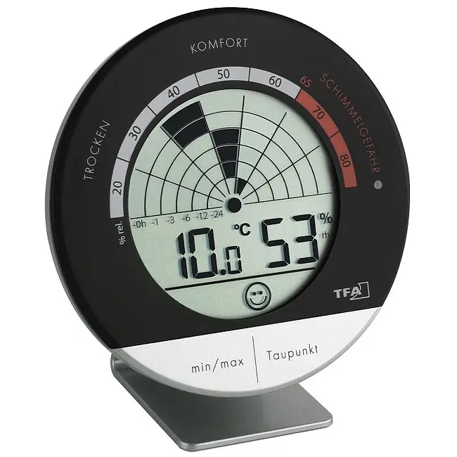 Виробник: TFA Dostmann GmbH & Co.KG, Germany Особливості: Дляздорового клімату в приміщенні Моніторинг температури і вологості повітря в приміщенні 24-годинний радар виявляє ризик цвілі Інноваційна графіка показує значення вологості, як на екрані радара Температура повітря в приміщенні Зони рівня комфорту. Смайлик як індикатор рівня комфорту Макс.-мін. значення Точка роси Акустична і візуальна функція тривоги (звуковий сигнал може бути відключений) Сенсорні кнопки Батарейки у комплекті