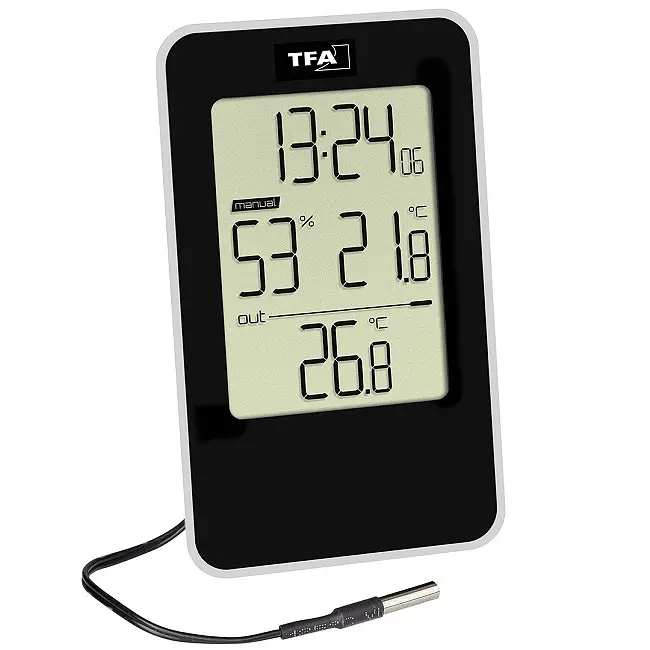Виробник: TFA Dostmann GmbH & Co.KG, GermanyОсобливості:Одночасне відображення клімату в приміщенні, температури зовнішнього повітря і часуТемпература і вологість у приміщенні для забезпечення здорового клімату в приміщенніТемпература зовнішнього повітря за допомогою водонепроникного проводового датчика, також ідеально підходить для холодильника, морозильної камери або акваріумаМаксимальні і мінімальні значення з ручним або автоматичним скиданнямЗареєстрований дизайн TFAЗа допомогою цього функціонального термогігрометра ви можете одночасно стежити за кліматом у приміщенні, температурою зовнішнього повітря і часом.Контролюючи температуру і вологість в житлових приміщеннях за допомогою цільового опалення та вентиляції, ви можете створити приємний і здоровий клімат в приміщенні і навіть заощадити на витратах на опалення.Збережені значення max-min автоматично скидаються щодня або їх також можна видалити вручну.Можливості застосування проводного датчика температури різноманітні і не обмежуються тільки вимірюванням температури зовнішнього повітря. Завдяки великому діапазону вимірювань, водонепроникний датчик можна використовувати також для контролю температури в холодильнику і морозильній камері або для вимірювання температури води в акваріумі.