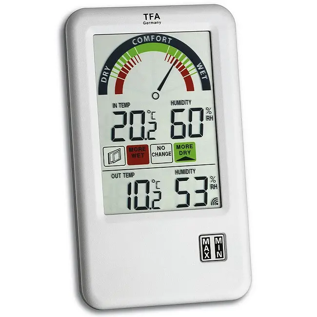 Виробник: TFA Dostmann GmbH & Co.KG, GermanyОсобливості:Бездротова передача зовнішньої температури і вологості через передавач. Одночасна перевірка внутрішнього і зовнішнього клімату. Поради по вентиляції, коли відкривати або закривати вікна для поліпшення клімату в приміщенні. Температура і вологість в приміщенні з кольоровими зонами комфортного рівня для здорового клімату приміщення. Макс.-мін. значення. Високоточний гігрометр з сенсором «Swiss Precision sensor»IT+ технологія радіопередачі сигналу від зовнішнього датчика. Зареєстрований дизайн TFA. Вікно відкрите або закрите? Знайти ідеальний клімат в приміщенні не так просто, і вентиляція не завжди є першим вибором. Залежно від погоди якість повітря може навіть погіршитися. Бездротовий термогігрометр "BEL-AIR" від TFA - це практична допомога, яка вам потрібна. Внутрішні датчики вимірюють температуру і вологість в приміщенні і відображають якість повітря в приміщенні на кольоровій шкалі. У той же час зовнішній передавач визначає температуру і вологість на відкритому повітрі і розраховує, чи підвищується вологість у приміщенні, залишається вона незмінною або зменшується при відкритті вікон. Таким чином, ви можете негайно зробити необхідні кроки, забезпечити комфортний і здоровий клімат в приміщенні і запобігти утворенню цвілі.