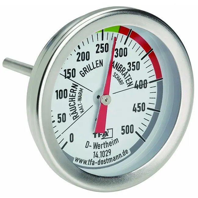Виробник: TFA Dostmann GmbH & Co.KG, GermanyОсобливості:Для перевірки температури варильної камериЗ кольоровим маркуванням діапазонів температур (копчення | гриль | обсмажування)Виготовлений з високоякісної нержавіючої сталіДля гриля, коптильні, коптильної печі або возика для гриля барбекюЯк запасна частина для дооснащення існуючого гриля або коптильні, для модернізації або самостійного складанняВстановлюється на кришку, витяжку або бічну стінкуНеобхідний діаметр отвору приблизно 10 ммЗ гайкою для фіксаціїЗареєстрований дизайн TFAІдеальний помічник для барбекю для всіх любителів м'яса, барбекю і гурманів. Будь то соковита тушкована свинина, реберця або ніжна свиняча вирізка, цей термометр показує ідеальну температуру в камері для непрямого гриля із закритою кришкою і дозволяє точно приготувати шматки м'яса в потоці гарячого повітря. Температурні діапазони з кольоровим маркуванням допоможуть вам вибрати правильну температуру для копчення, гриля або обсмажування до 500 °C. Термометр для барбекю гриля коптильні виготовлений з високоякісної нержавіючої сталі і може використовуватися в якості запасної частини або в якості модернізації існуючого гриля, коптильні, коптильної печі або возика для гриля-барбекю. Для кріплення до кришки, витяжки або бічної стінки потрібен отвір діаметром приблизно 10 мм. Термометр просто вставляється в заздалегідь просвердлений отвір і фіксується зсередини за допомогою комплектної гайки і болта.